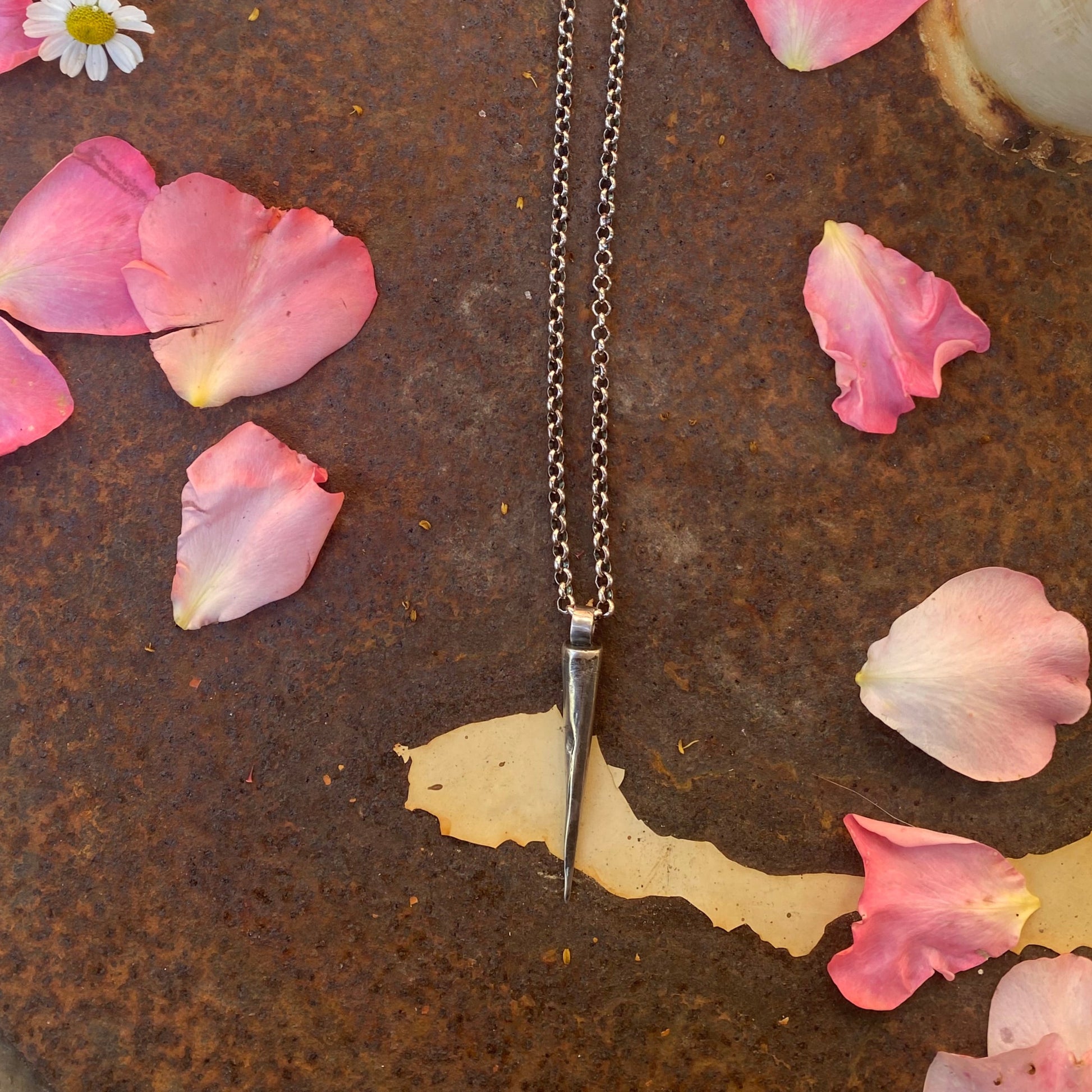 Hand forged cone pendant necklace on a thick cable chain.