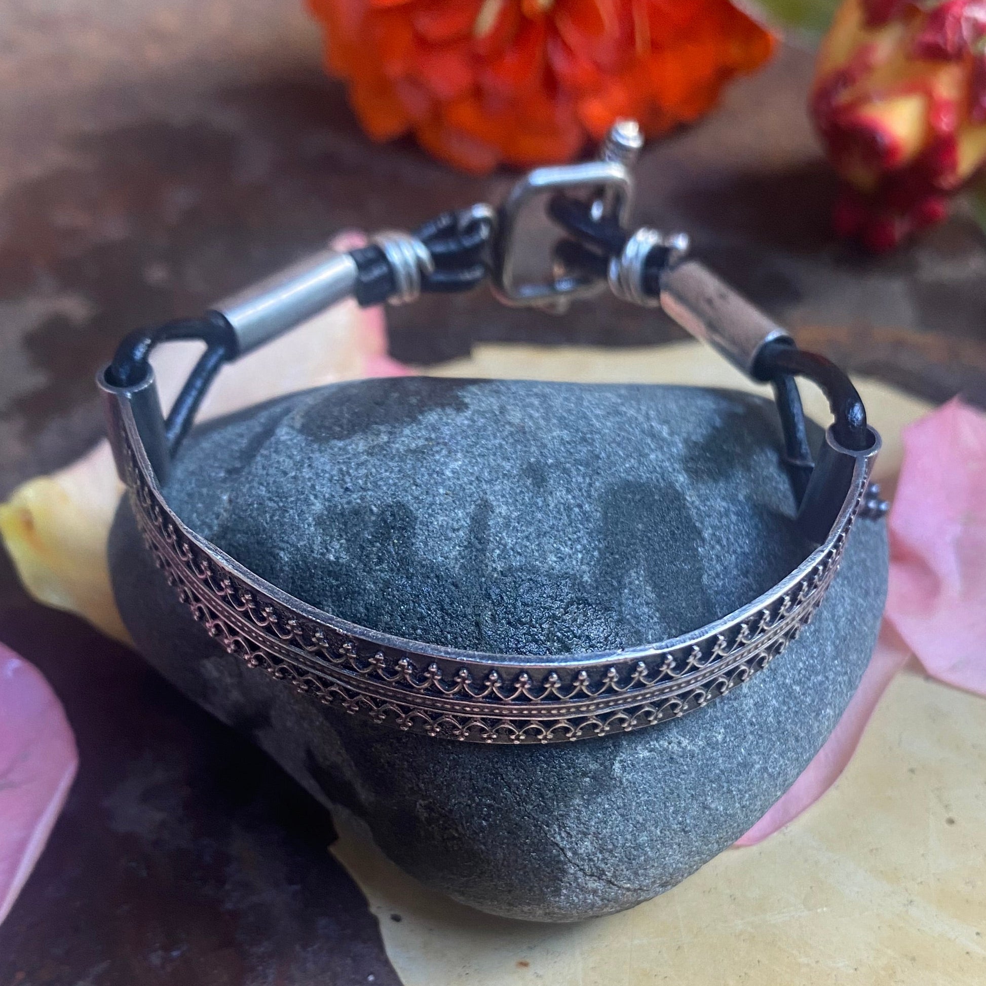 Bracelet with fine silver gallery wire and genuine leather with a little tiny Bali bead dangle .